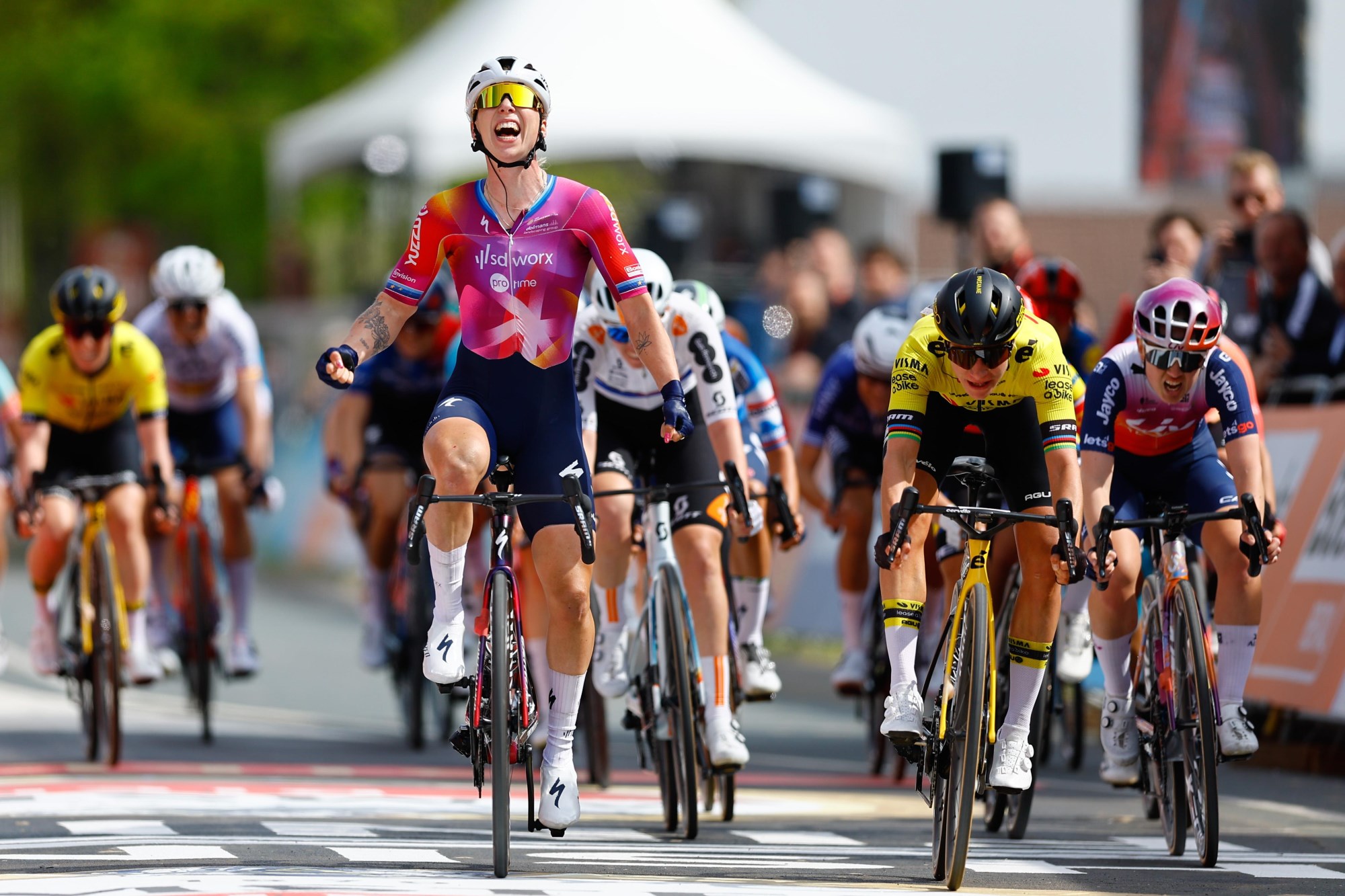 Marianne Vos verrast Lorena Wiebes op de streep in Amstel Gold Race