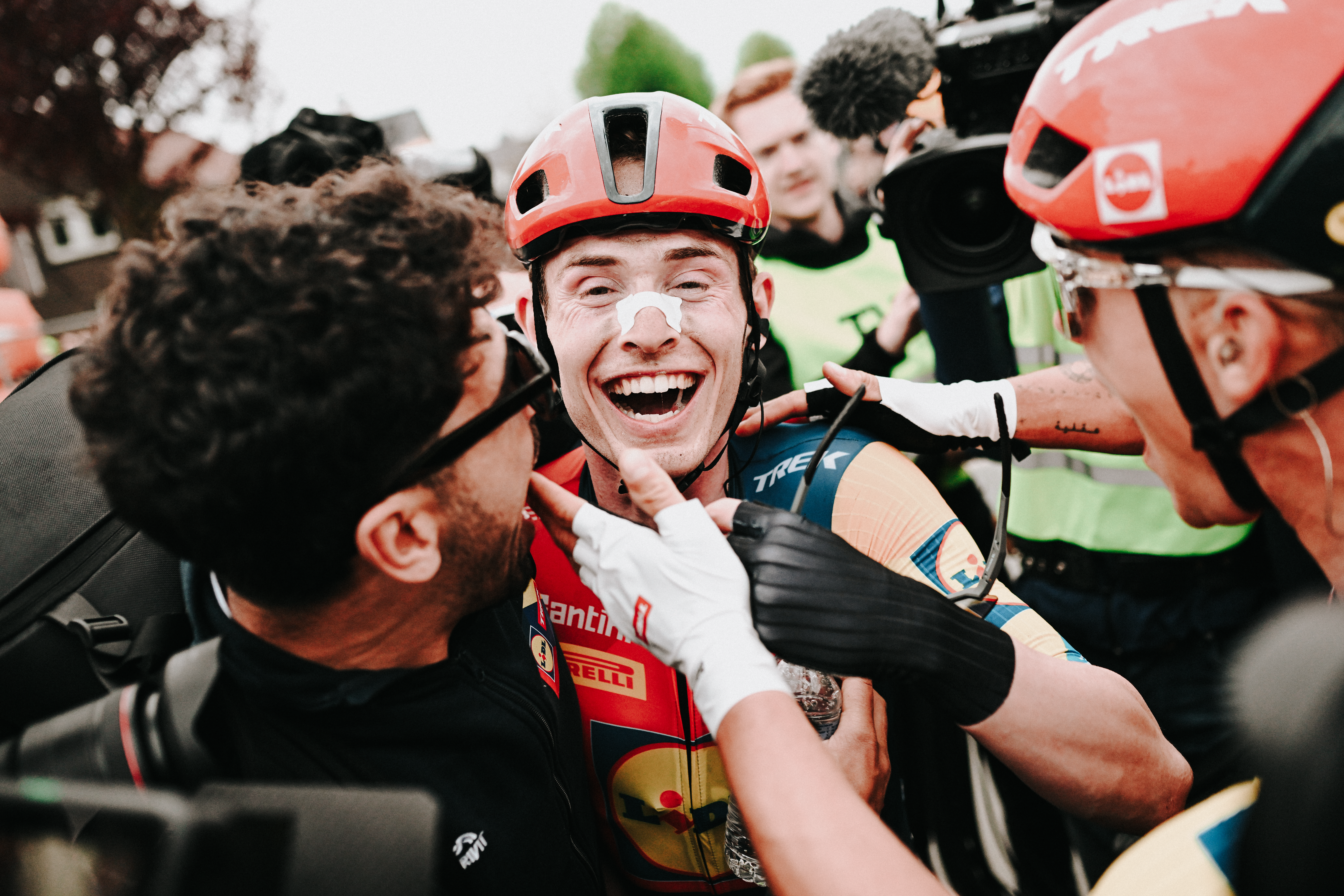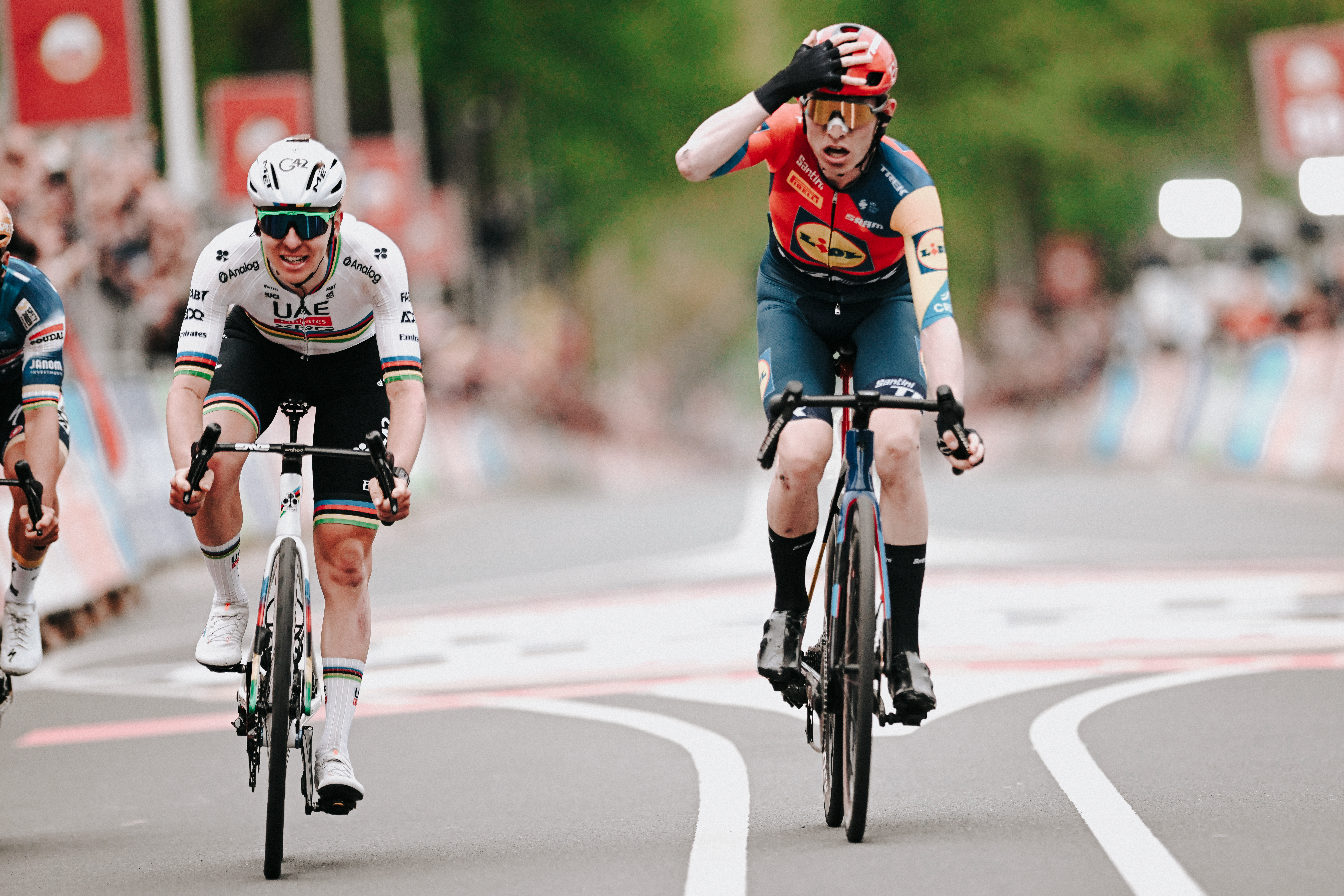 De vreugde bij Skjelmose staat in schril contrast bij de teleurstelling bij Pogacar. Hoewel de wereldkampioen de ene na de andere grote wedstrijd in zijn loopbaan heeft gewonnen, doet de tweede plek hem toch pijn. “Julian Alaphilippe heeft de wedstrijd voor mij hard gemaakt met zijn versnelling op de Gulperberg”, wijst hij naar het moment op 47 kilometer van de streep dat hij zijn aanval inzette. Een klim verder, op de Kruisberg begint de Sloveen aan zijn solo.
