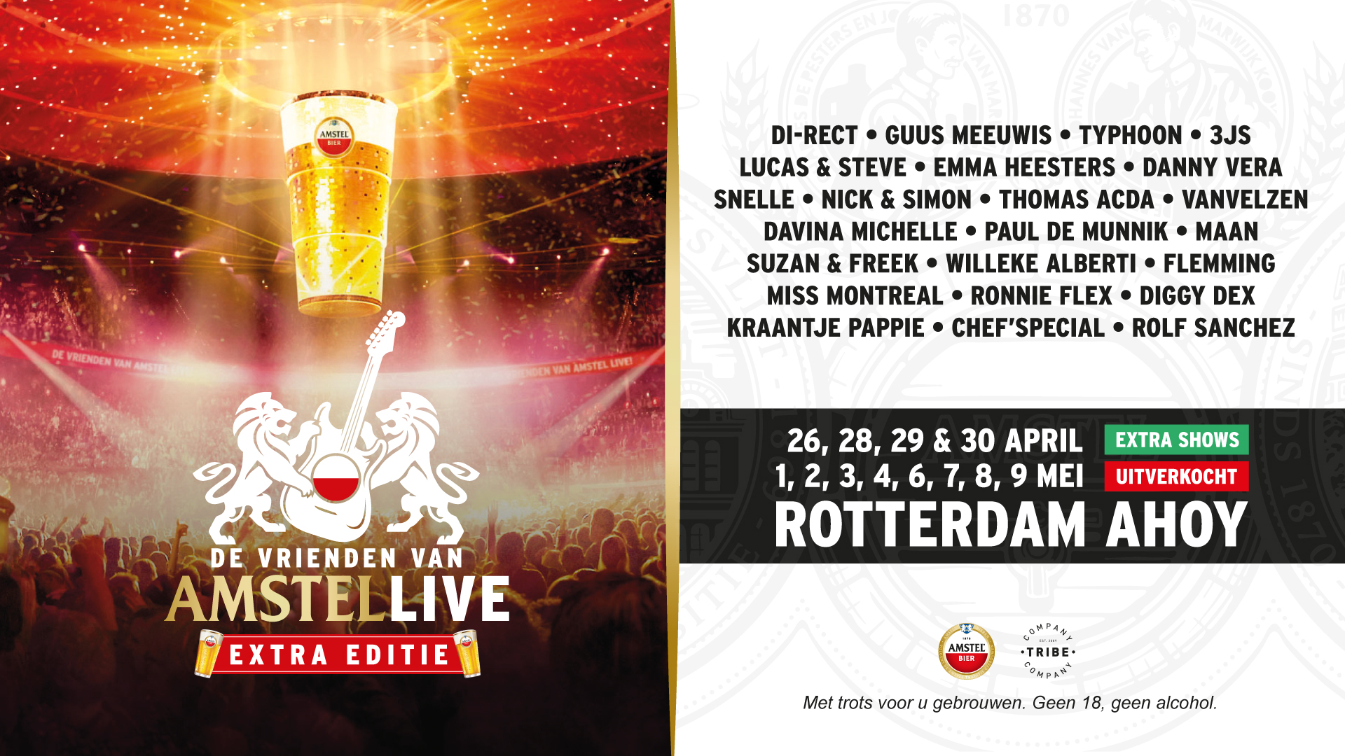 De Vrienden van Amstel LIVE heeft de extra editie uitgebreid tot twaalf shows. Naast 1, 2, 3, 4, 6, 7, 8 en 9 mei opent de grootste Amstel kroeg van Nederland haar deuren ook op 26, 28, 29 en 30 april. Alle kaarten voor de extra concertreeks in mei vlogen vanochtend binnen een uur de deur uit waarna de organisatie besloot om meer mensen de gelegenheid te bieden om het jaarlijkse feest in Ahoy bij te wonen. De verkoop is per direct gestart via de website van het evenement vriendenvanamstel.nl.
