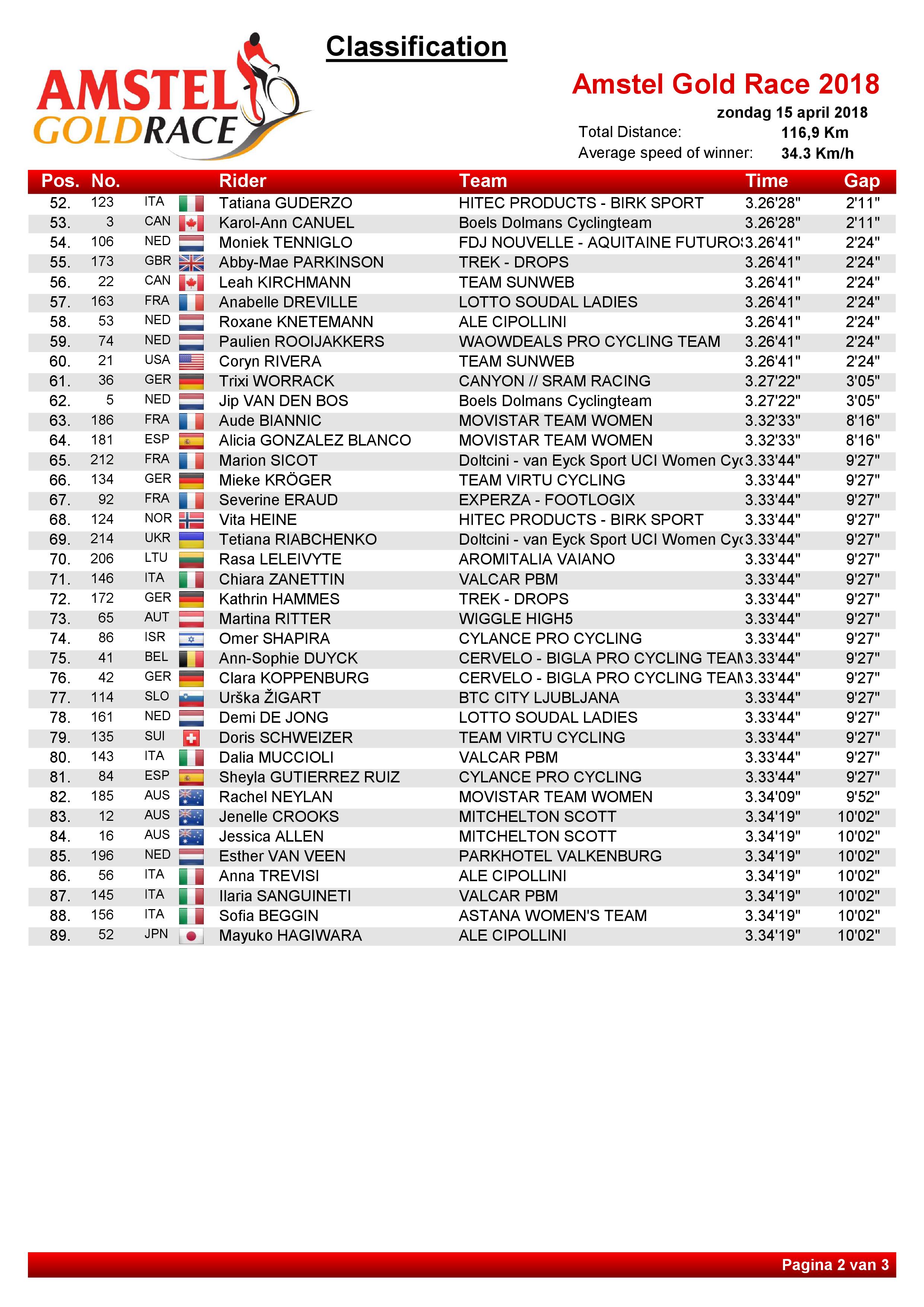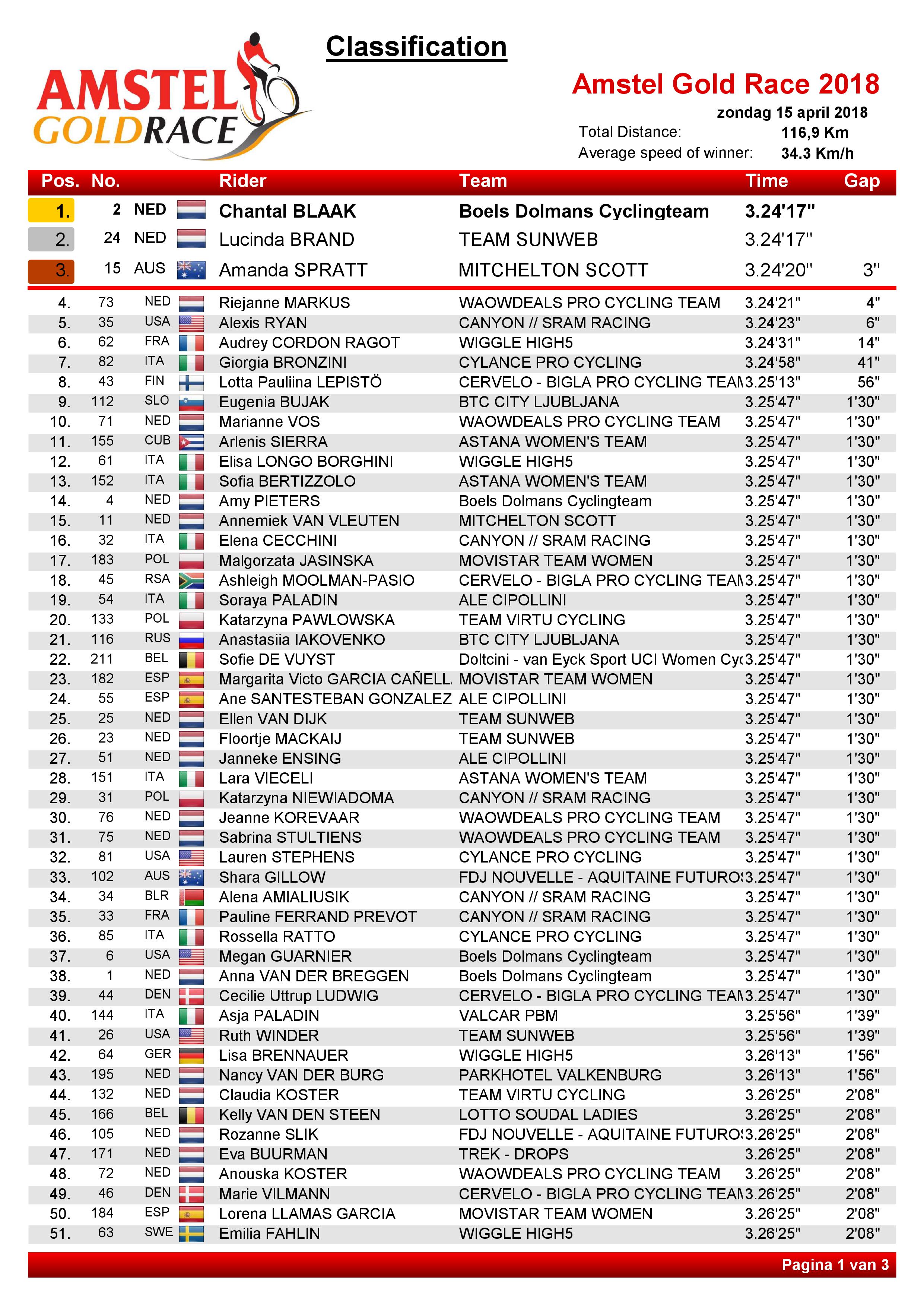 Chantal Blaak (Boels-Dolmans) heeft de tweede editie van de Amstel Gold Race voor Elite Dames gewonnen. In de finale rond Valkenburg, waar onder meer drie keer de Cauberg werd beklommen, stond geen maat op de wereldkampioene. Lucinda Brand (Team Sunweb) werd tweede, voor Amanda Spratt (Mitchelton-Scott).